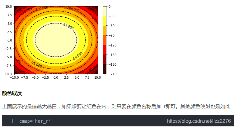 X,Y = np.meshgrid(x,y) #写入函数,z是大写,这里我让中间的0是最大,加了一个负号 Z = -(X**2+Y**2) #填充颜色,f即filled,6表示将三色分成三层,cmap那儿是放置颜色格式,hot表示热温图(红黄渐变) #更多颜色图参考:https://blog.csdn.net/mr_cat123/article/details/80709099 #颜色集,6层颜色,默认的情况不用写颜色层数, cset = plt.contourf(X,Y,Z,6,cmap=plt.cm.hot) #or cmap='hot'#画出8条线,并将颜色设置为黑色